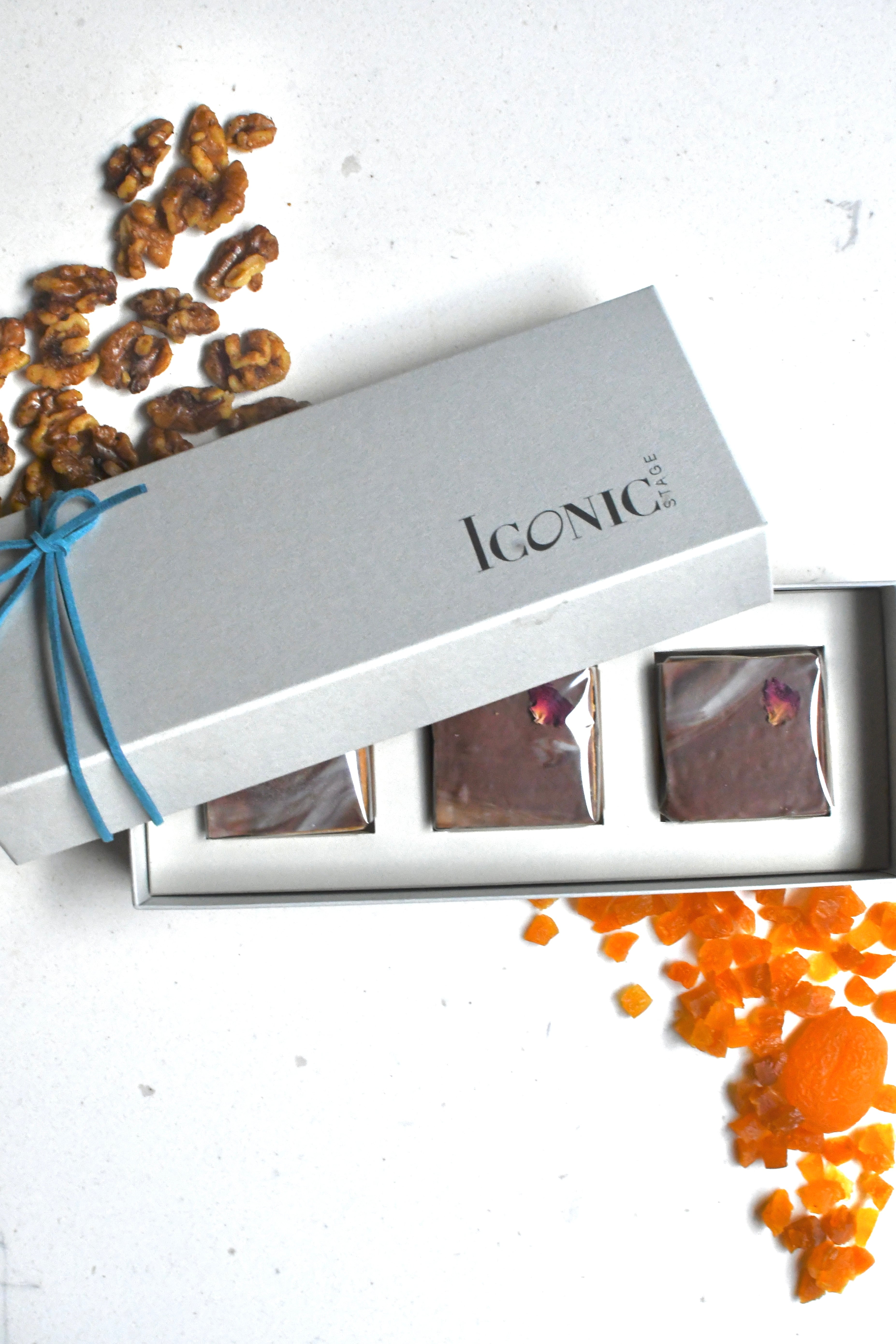 マーブルチョコレートとココナッツクッキーに包まれたくるみと杏の華麗なハーモニー。